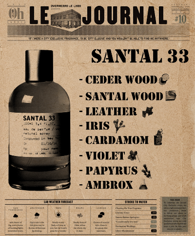 상탈33의 주원료는 샌달우드, 버지니아 시더, 카다멈, 바이올렛, 파피루스, 가죽, 엠버, 아이리스 등이 있습니다.