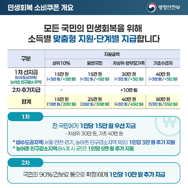 민생회복 소비쿠폰은 전 국민으로 대상으로 하되, 소득 수준 및 거주 지역에 따라 차등 지급 되는 정책입니다.