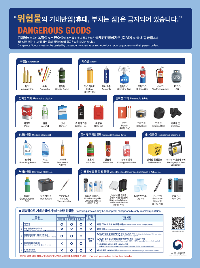 - 기타 위험 물질 : 소화기 ,살충제, 락스, 파마약, 등 탑승 및 항공기에 위험이 될 가능성이 있는 물질