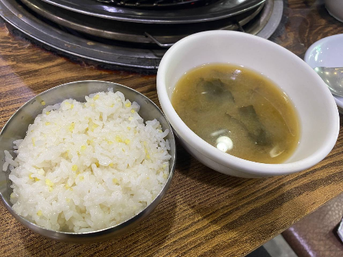 밑반찬은 생선구이와 함께 먹기 좋은 반찬들로 거의 바뀌지 않고는 것 같고 밥과 된장미역국이 나오는데 미역국이 짭짤한것이 매우 밥도둑입니다.