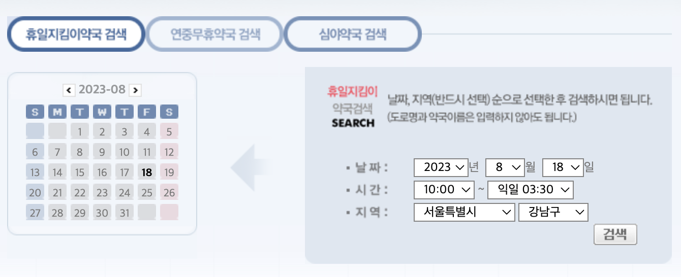 휴일지킴이약국 검색을 클릭하시면 크게 휴일지킴이약국 검색, 연중무휴약국 검색, 심야약국 검색 세가지로 검색이 가능합니다.