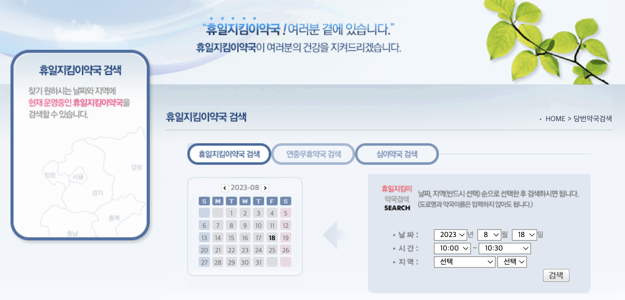 (사)대한약사회가 운영하는 시스템인 휴일지킴이 약국 안내시스템은 약국이용의 편의성을 높이고 국가보건 향상에 기여하기 위해여 운영되고 있는데요. 이 사이트를 통해서 휴일지킴이약국 (각 지역마다 당번제로 24시간 혹은 심야, 그리고 명절 등 공휴일에 운영하는 약국), 연중무휴 약국, 심야약국 을 실시간으로 검색할수 있습니다.