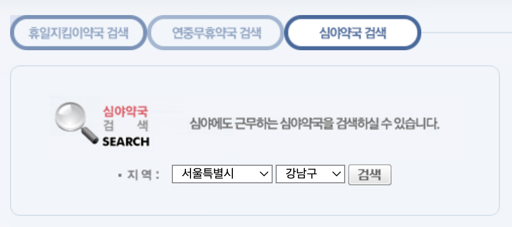 야간시간 (저녁 6시부터 익일 아침8시까지)에 접속하시는 분들은 연중무휴약국 및 심야약국을 검색할수 있는데요. 지역과 세부지역을 선택하신후 검색을 누르시면 검색 결과가 나옵니다.