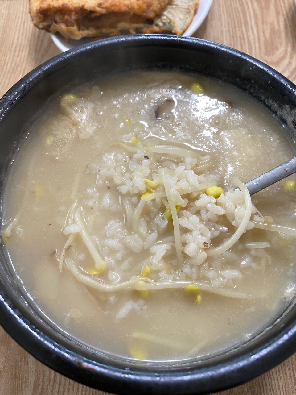 감나무식당의 송이황태국밥은 이미 밥이 말아져있는 상태로 나오는데요. 마치 죽같기도 하고 황태는 갈아서 나오기때문에 씹히거나 걸리는 것은 콩나물물과 밥밖에 없지만 정말 찐한 국물과 깊은맛에 한번드셔보시면 또 방문하게되는 그런 가게입니다.