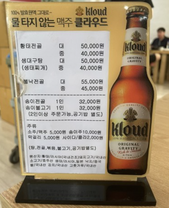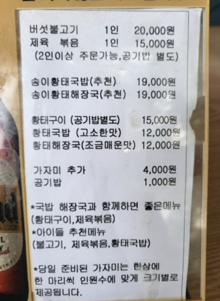 감나무 식당에는 전골과 탕 그리고 국밥과 황태구이를 판매하는 곳인데 이중에서 가장 추천드리는 메뉴는 바로 송이황태국밥입니다.