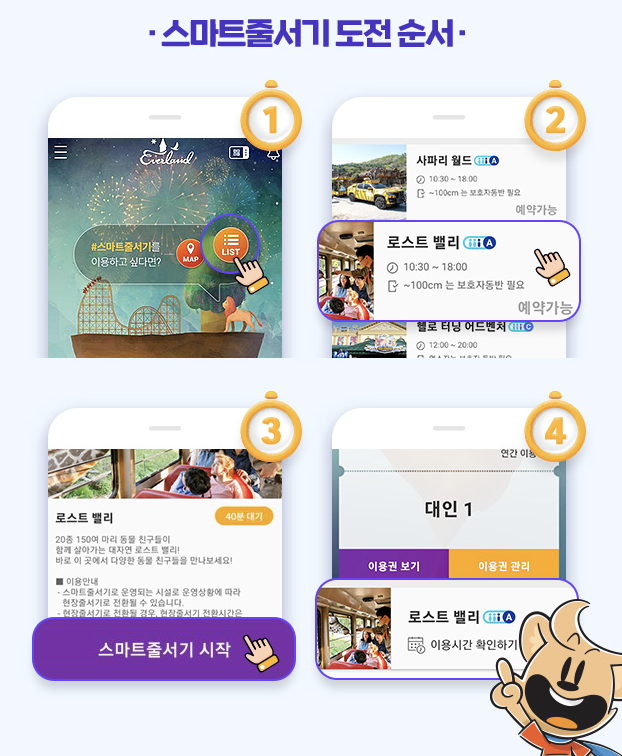 모든 어트랙션에 해당하는 것은 아니고, 사람들이 가장 많이 찾는 놀이기구의 줄서기를 스마트폰으로 할 수 있는 것입니다. 대상은 티익스프레스, 로스트벨리, 사파리, 판다원드, 범퍼카, 슈팅고스트 등이 있습니다.