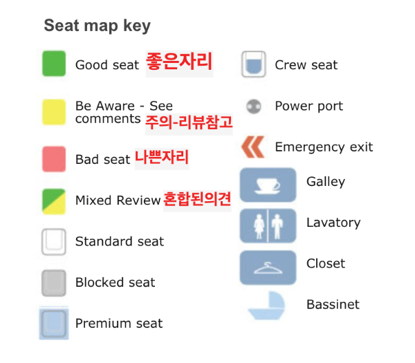 화면의 하단에 Seat map key를 확인 할수 있습니다. 이미 많은 사람들이 선정한 좋은 자리와 주의해야 할 자리, 나쁜 자리, 좋은 의견도 있지만 나쁜 의견도 존재하는 자리를 알려주고 있습니다. 해당 좌석에 마우스를 가져다 대면 리뷰를 볼 수 있는데요.