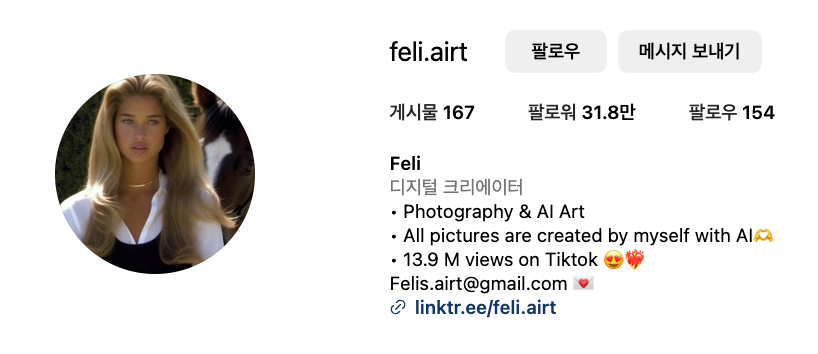 ai모델 펠리는 지금 미국에서 엄청난 인기를 끌고 있습니다. 무려 인스타그램 팔로우가 30만 명이 넘는 펠리는 상류층의 삶과 스타일을 고스란히 나타내고 있습니다.