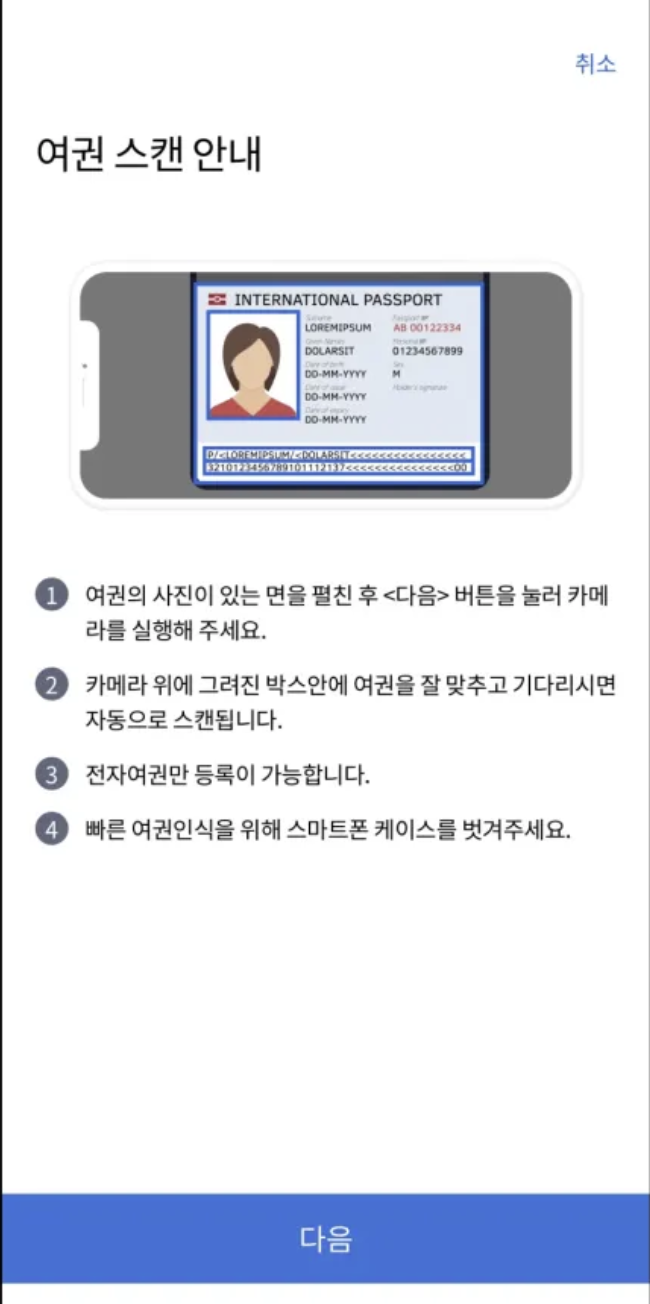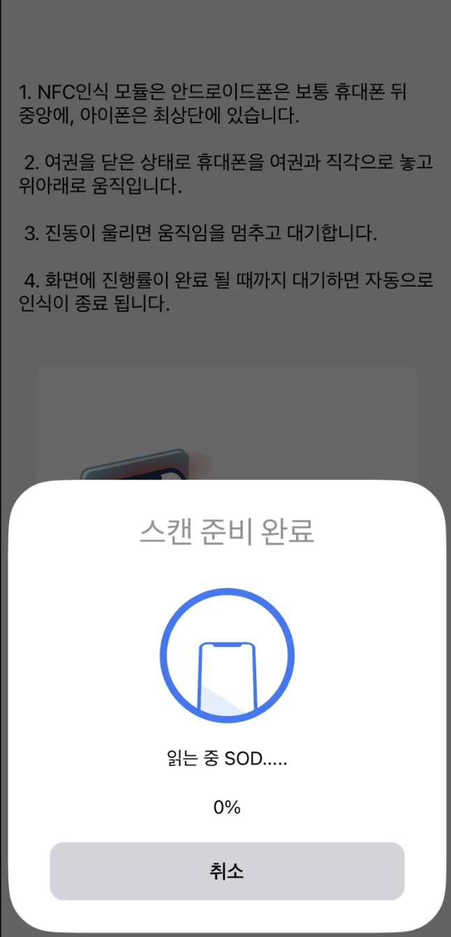 2. 여권 전자칩스캔 : 여권을 닫은 상태에서 휴대폰과 여권을 직각으로 놓고 위아래로 움직입니다. 진동이 울리면 완료된 것입니다.