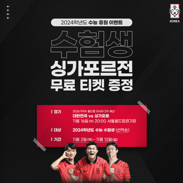 수능 당일 오후 8시에 서울 월드컵 경기장에서 한국과 싱가포르의 2026년 FIFA 월드컵 아시아 2차 예선전이 열립니다. 이때 선착순 2000명을 대상으로 수험생들에게 수험생 쿠폰을 증정하는데요. 티켓 예매시 SG, SH 수험생 할인석을 선택하고, 경기당일 북측 매표소에서 종이티켓 발권후 입장을 하면 됩니다.