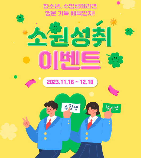 홈페이지에서 쿠폰을 적용해 예매가 가능하고 선착순 5,00명에겐 팝콘 교환권도 진행합니다. 또한 수능이 끝나면 가장 하고 싶은 wish list를 투표하고 경품을 받는 이벤트와 19세이하 신규 가입자들에게 영화 1+1쿠폰과 콤보 50%할일 쿠폰을 증정하는 이벤트도 진행합니다.